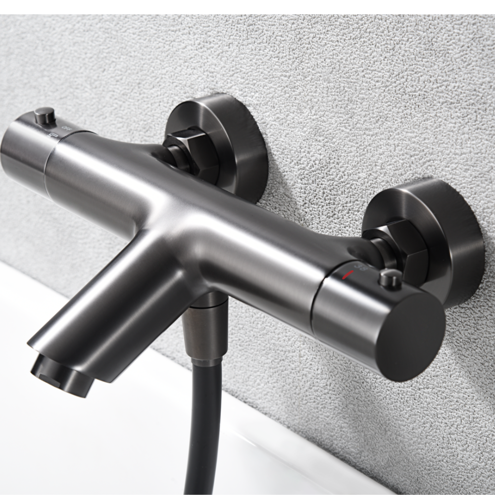 Grifería baño / ducha de latón. Acabado: Black Gun Metal (PVD). Flexo de PVC 1,8 m Soporte para mando de ducha de ABS Mango ducha redondo. Caudal medio 12 l/min Cartucho termostático TURN CLEAN SYSTE