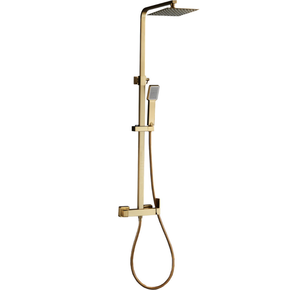 Incluye: Rociador disponible en tamaño 20, 25 y 30 cm, barra extensible de 80cm a 120 cm, cuerpo de la grifería con cartucho y maneta cuadrada, flexo y alcachofa de mano