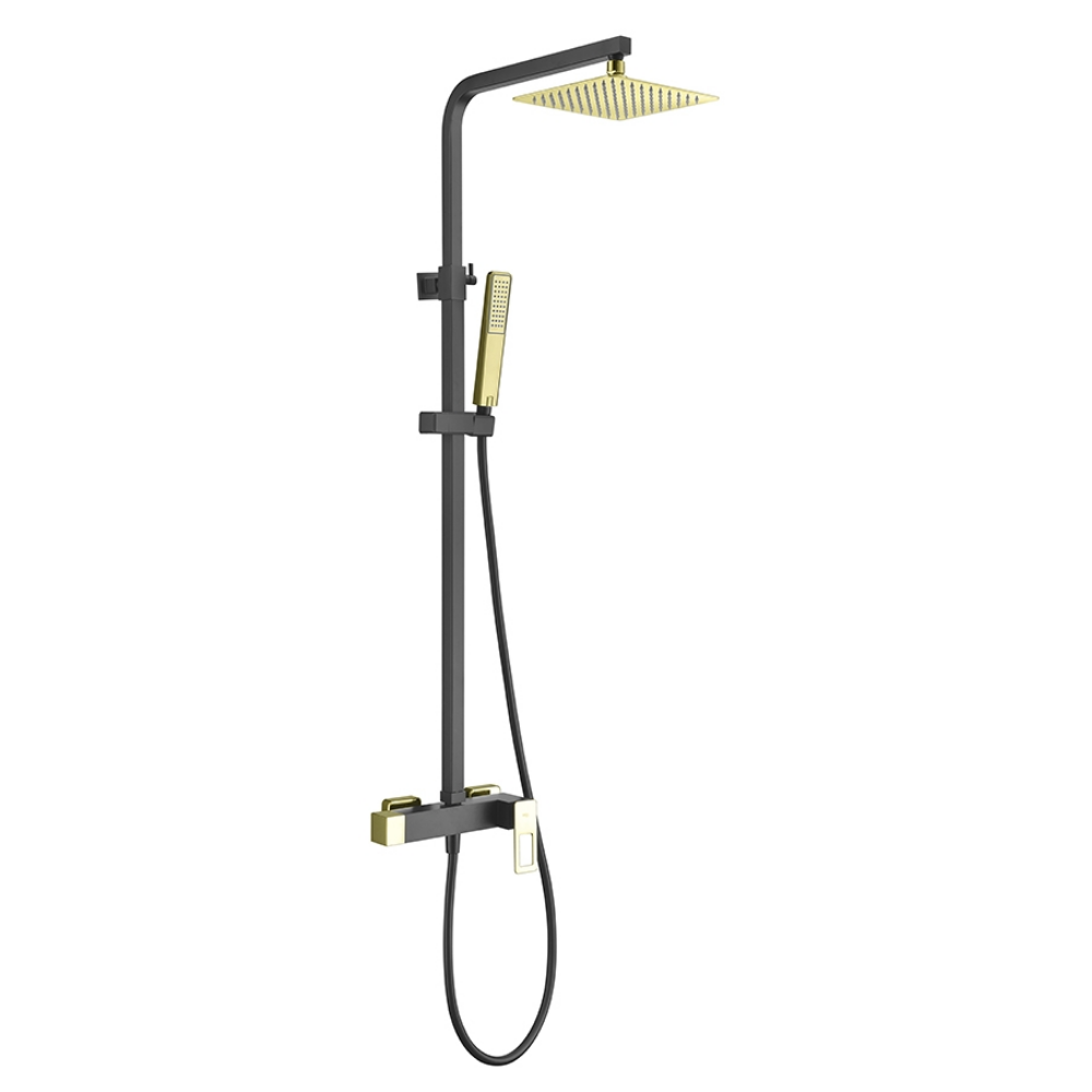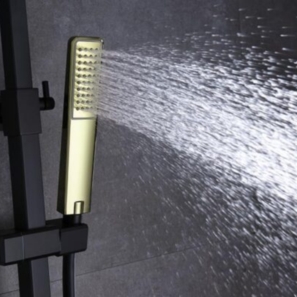 Distribuidor cuadrado de latón oro brillo, integrado en la grifería.