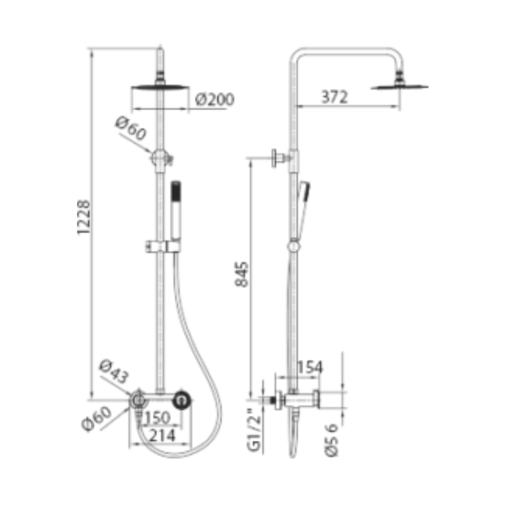 Barra de ducha extensible de acero inox S304. extensible. Rociador de acero inox. redondo Ø20cm, extraplano y antical. Soporte teléfono regulable en altura. Mango ducha redondo de 1 posición. Grifería de latón. Caudal medio 12 l/min. Distribuidor redondo de latón. Flexo metálico 1,5 m Cartucho cerámico Ø35 mm TOP.
