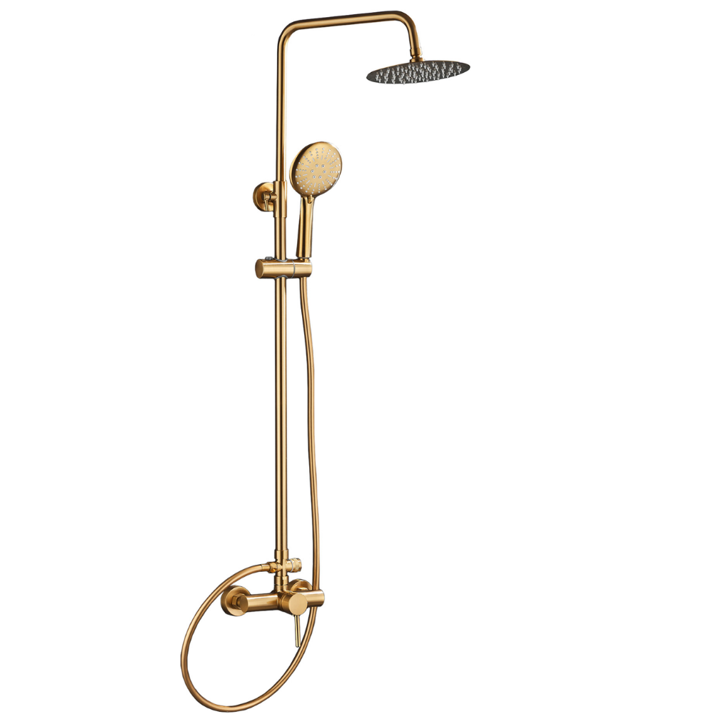 La barra de ducha monomando de la Serie Ebro ofrece un diseño redondo y funcional, ideal para quienes buscan una instalación sencilla y elegante. Su acabado en dorado cepillado proporciona un toque moderno y duradero, combinado con el control monomando para una experiencia de ducha cómoda y eficiente.