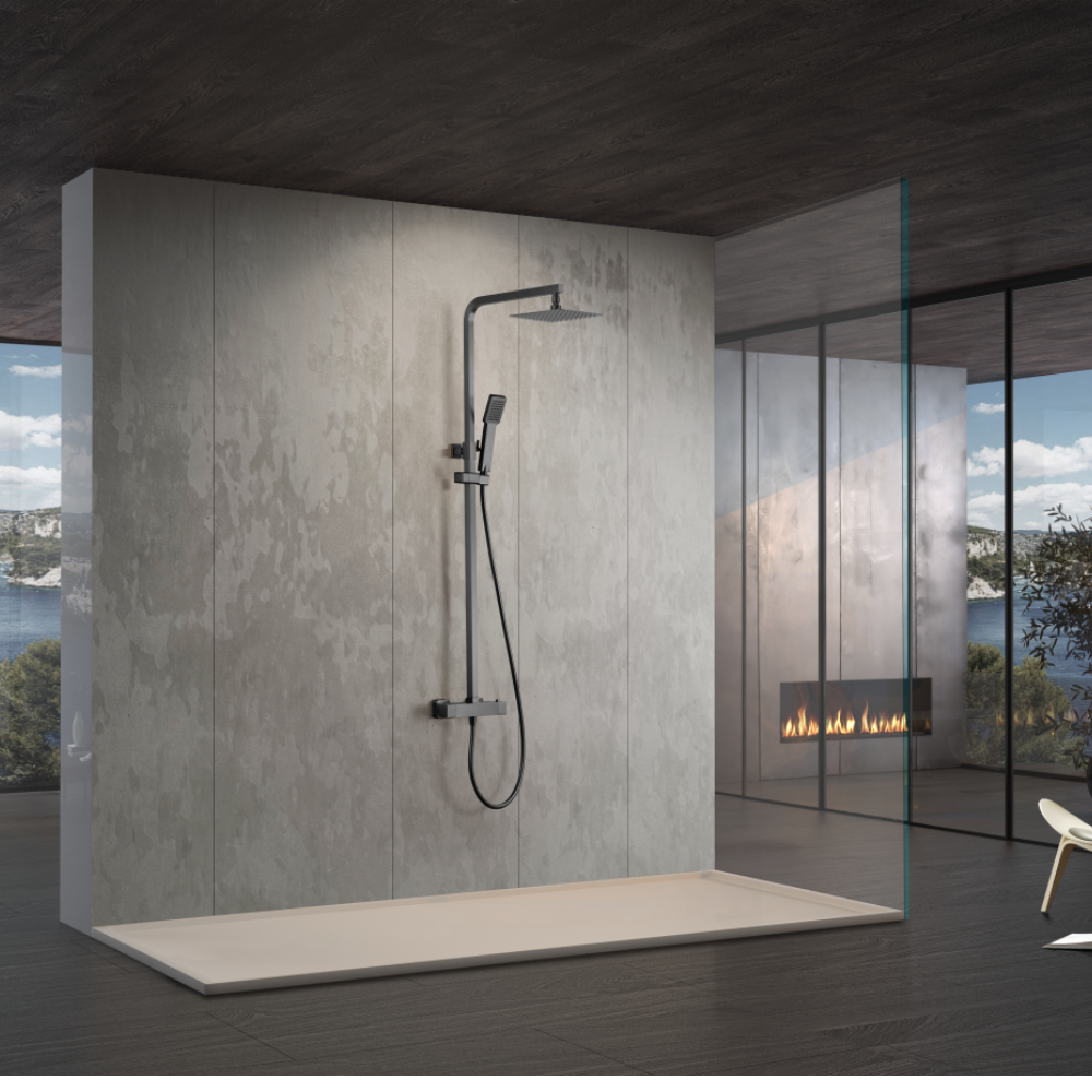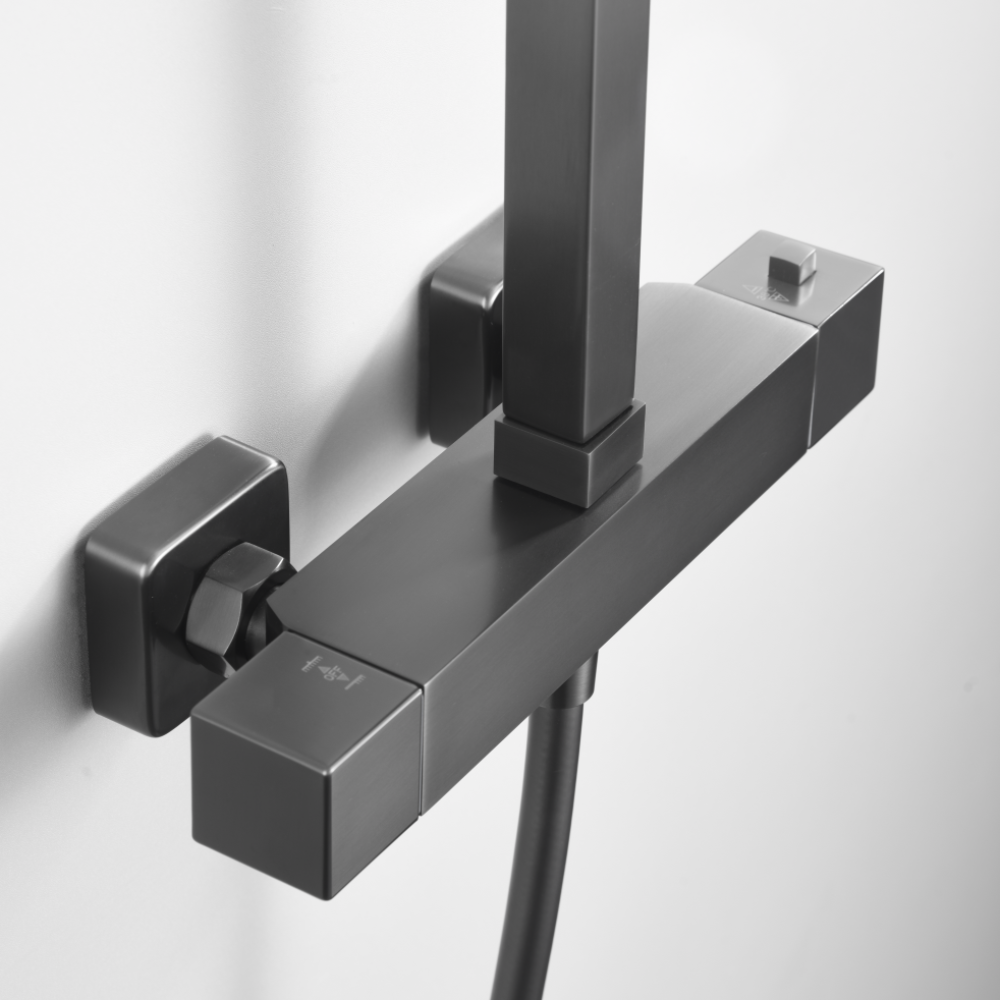 Grifería termostática de latón cromado con distribuidor incorporado.