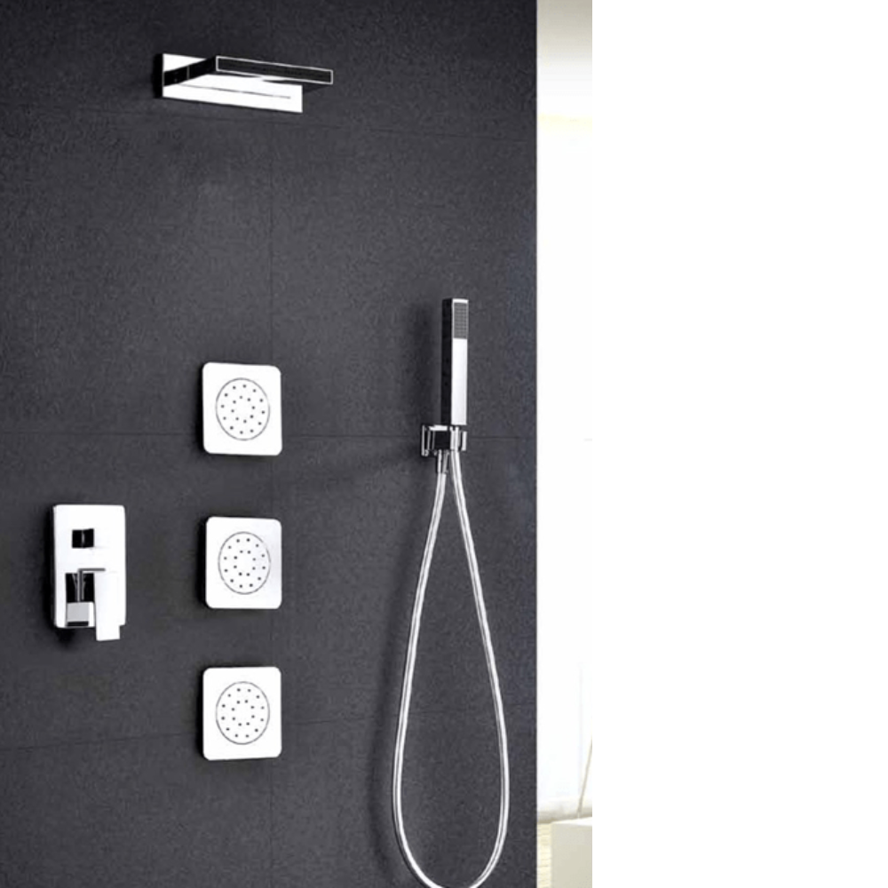 Rociador cascada 30 cm, cromado, acero S304. Mango ducha Cuadrado. Grifería monomando de latón cromado de 3 vías. Caudal medio 12 I/min. Distribuidor Cuadrado de latón cromado. Flexo PVC 1,5 m. Cartucho monomando cerámico de 35mm. Tres Jet Latón cromado y antical. Soporte mango ducha salida a pared.