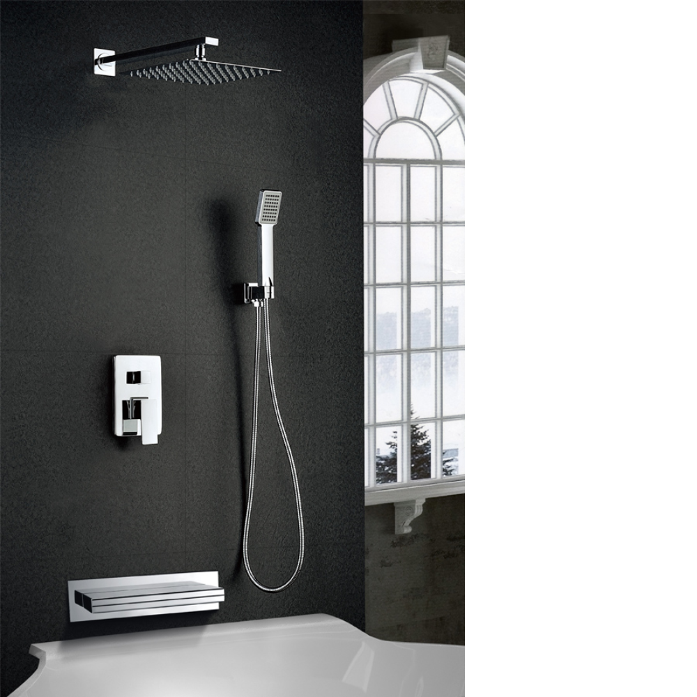 Rociador Cuadrado 25×25 cm cromado y antical. Mango ducha Cuadrado 1 posición. Grifería monomando de latón cromado 3 vías. Caño de bañera cascada de 30 cm, acero S304. Caudal medio 12 l/min. Distribuidor Cuadrado de latón cromado. Flexo PVC 1,5 m. Cartucho monomando cerámico 35mm. Soporte mango ducha salida a pared. Tubo pared cuadrado.