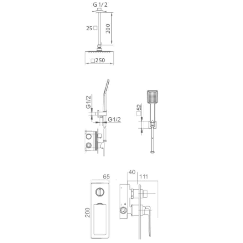 Rociador de acero inox. Cuadrado 25X25cm, extraplano y antical.