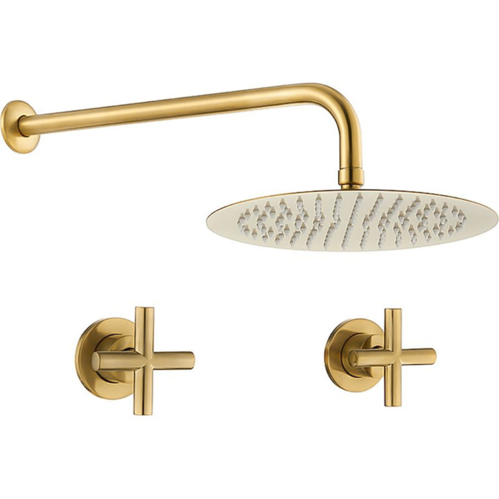 Ducha empotrada con diseño clásico y elegante, equipada con un sistema bimando para un control preciso del agua. Su acabado en oro mate con protección PVD garantiza resistencia y durabilidad.