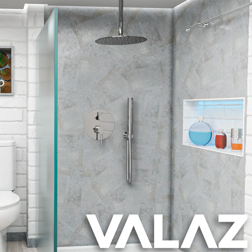 Incluye: Rociador disponible en tamaño 20, 25 y 30 con soporte a techo, termostática de 2 vías (rociador efecto lluvia y alcachofa de mano) flexo de 150cm y alcachofa de mano con soporte.