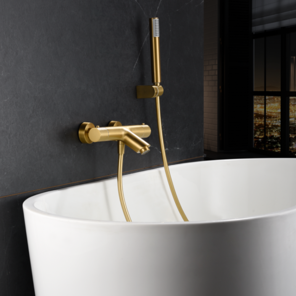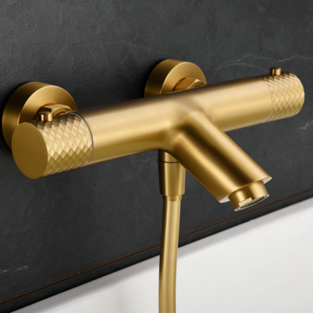Grifería para baño/ducha en latón. Acabado oro cepillado. Soporte para mango de ducha ABS. Mango de ducha redondo de 1 posición. Flexo PVC 1.8 m. Caudal medio 12 l/min. Cartucho termostático auto-limpiable TURN CLEAN SYSTEM (exclusivo)