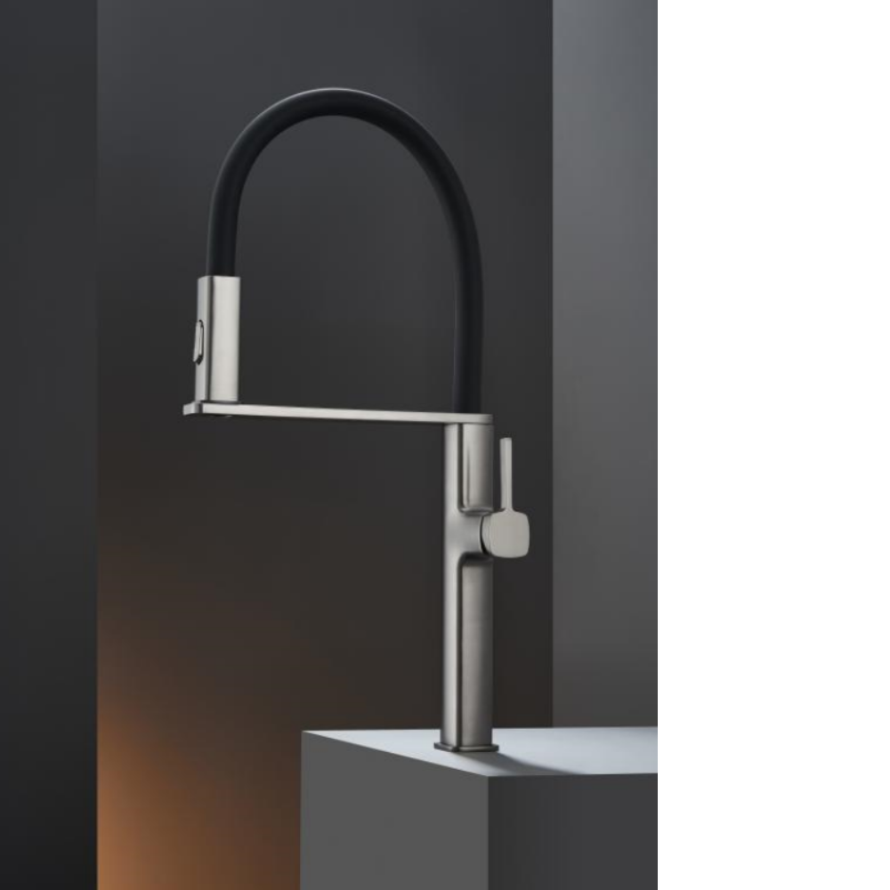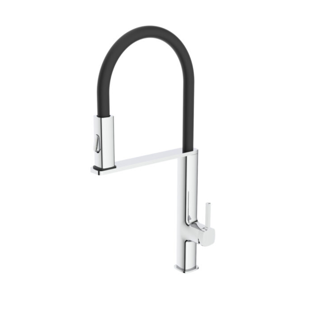 Grifería monomando. Caño flexible. Difusor con dos funciones. Cuerpo de grifería de latón. Acabado cromo. Cartucho cerámico Ø25mm. Latiguillos Ø3/8”