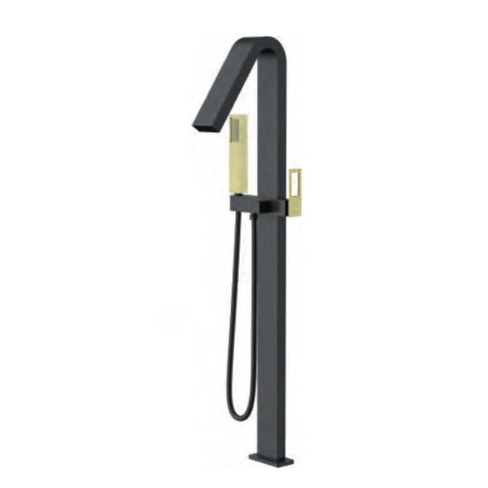 Grifería exenta de bañera en latón negro mate oro brillo. Cartucho cerámico de 35 mm . Mango de ducha cuadrado negro oro brillo. Maneta Imex mod. SUECIA negro oro brillo Flexo PVC negro mate. Caja de registro a suelo.