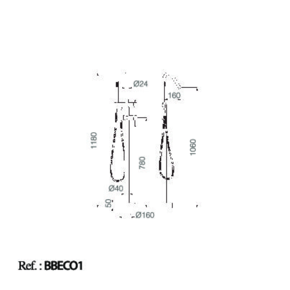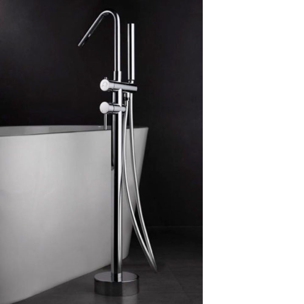 Griferia exenta de bañera en latón. Acabado cromado. Cartucho cerámico Ø35 mm. Mango de ducha redondo. Flexo de pvc. Caja de registro a suelo