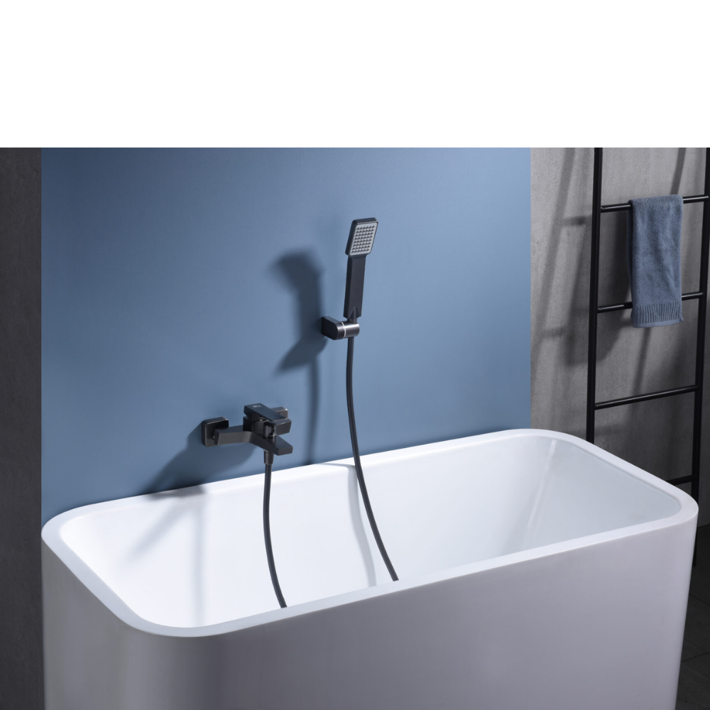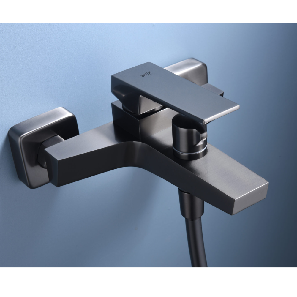 Grifería para baño/ducha en latón. Acabado black gun metal. Soporte para mango de ducha de ABS. Mango ducha cuadrado 1 posición. Flexo PVC 1.80 cm. Caudal medio 12 l/min. Cartucho monomando cerámico Ø 35mm.
