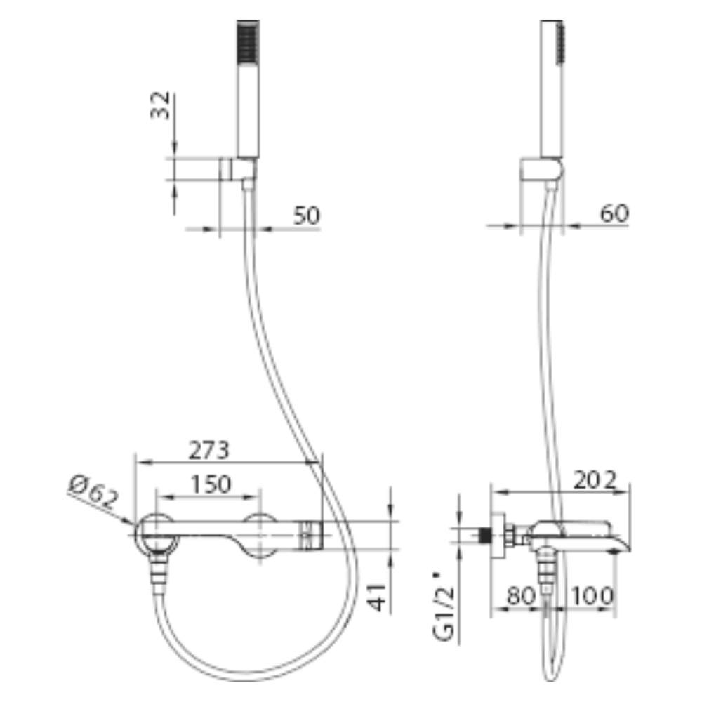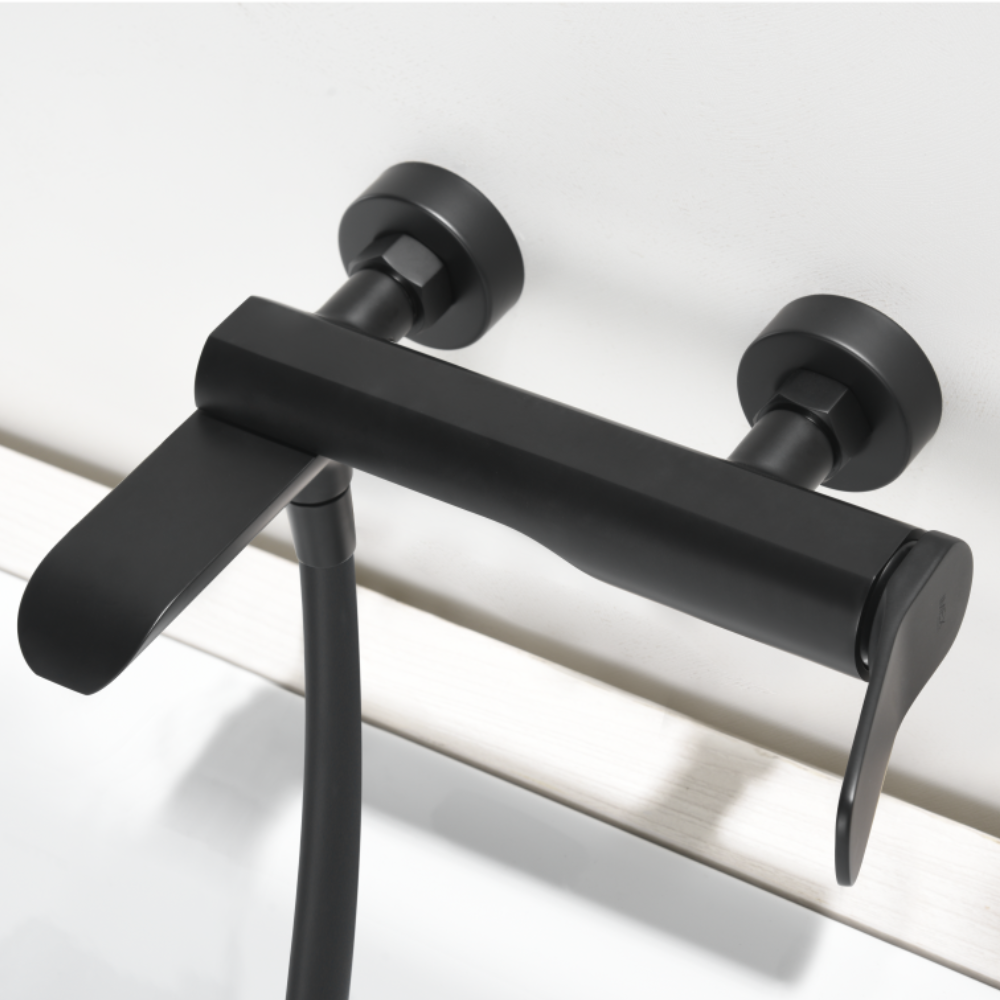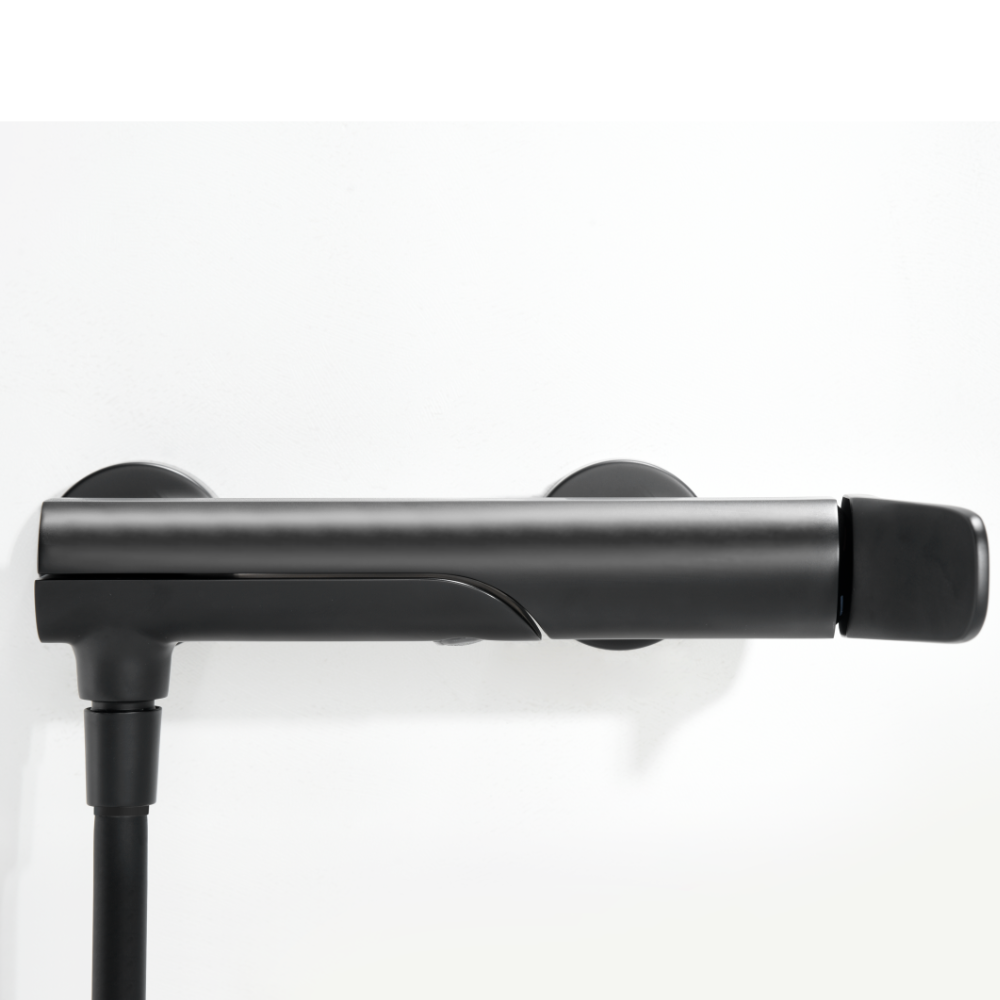 Grifería para baño/ducha en latón. Acabado negro mate. Soporte para mango de ducha de ABS. Mango ducha 1 posición. Flexo PVC 1.80m. Caudal medio 12 l/min. Cartucho monomando cerámico Ø 35mm.