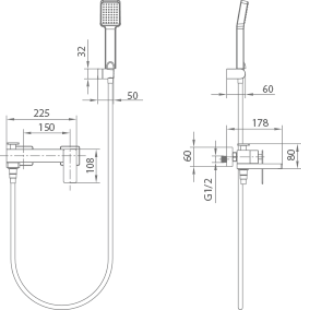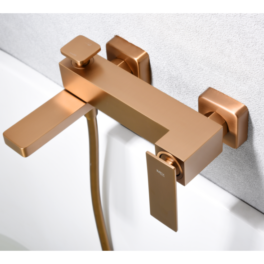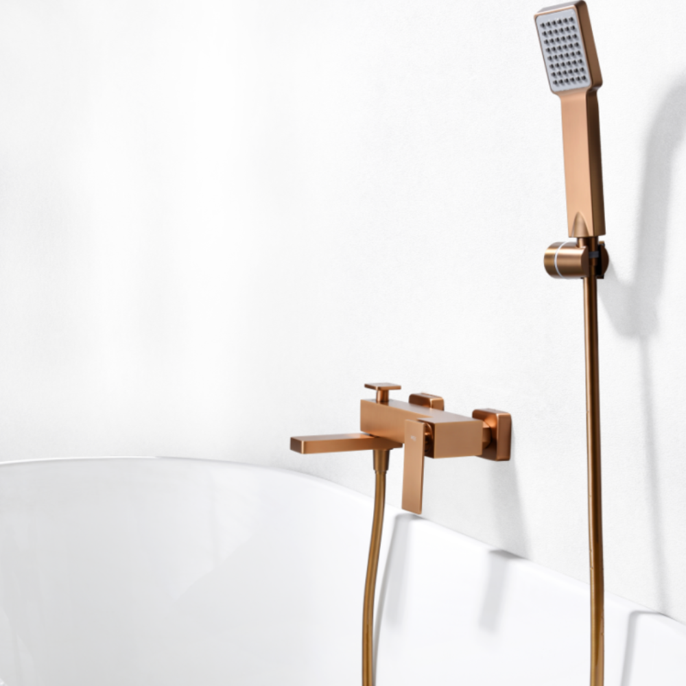 Grifería para baño/ducha en latón. Soporte para mango de ducha de ABS. Mango ducha cuadrado. Caudal medio 12 I/min. Flexo PVC 1,8m. Cartucho monomando cerámico Ø35mm. Acabado oro rosa cepillado.