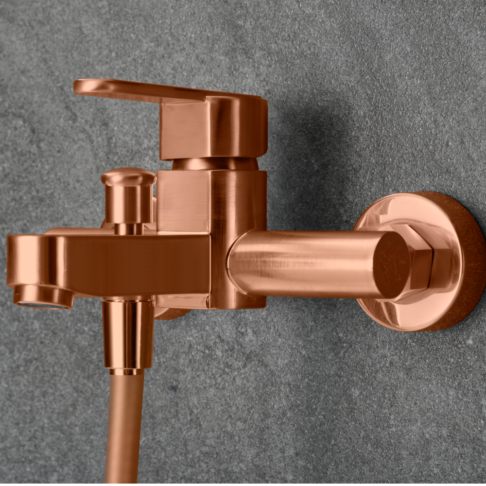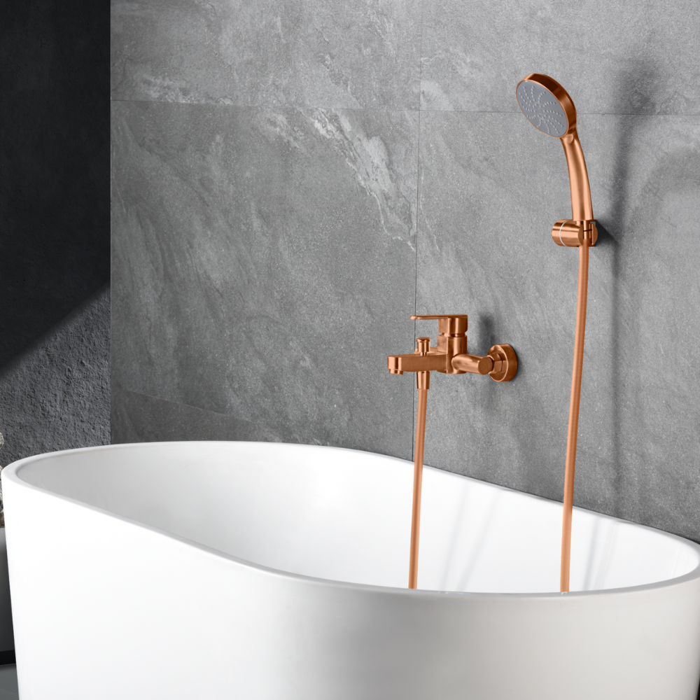 Grifería baño / ducha de latón. Flexo PVC 1,8 m Soporte para mando de ducha de ABS Mango ducha redondo. Caudal medio 12 l/min Cartucho monomando cerámico Ø35mm. Acabado oro rosa cepilla