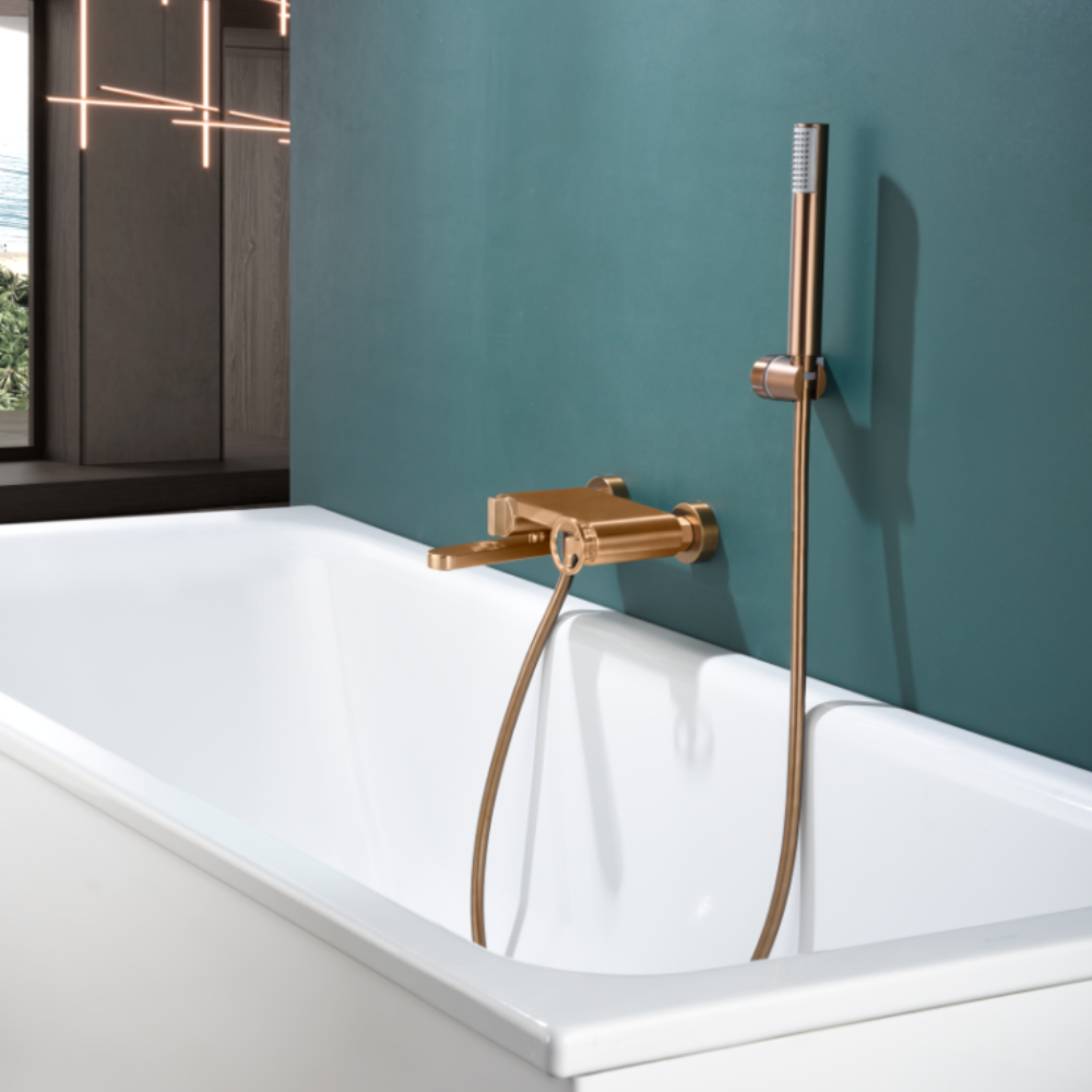 Grifería baño/ducha latón. Soporte para mango de ducha de ABS. Mango ducha redondo. Caudal medio 12 I/min. Flexo reforzado PVC 1,7m. Cartucho monomando cerámico Ø35mm TOP. Acabado oro rosa cepillado