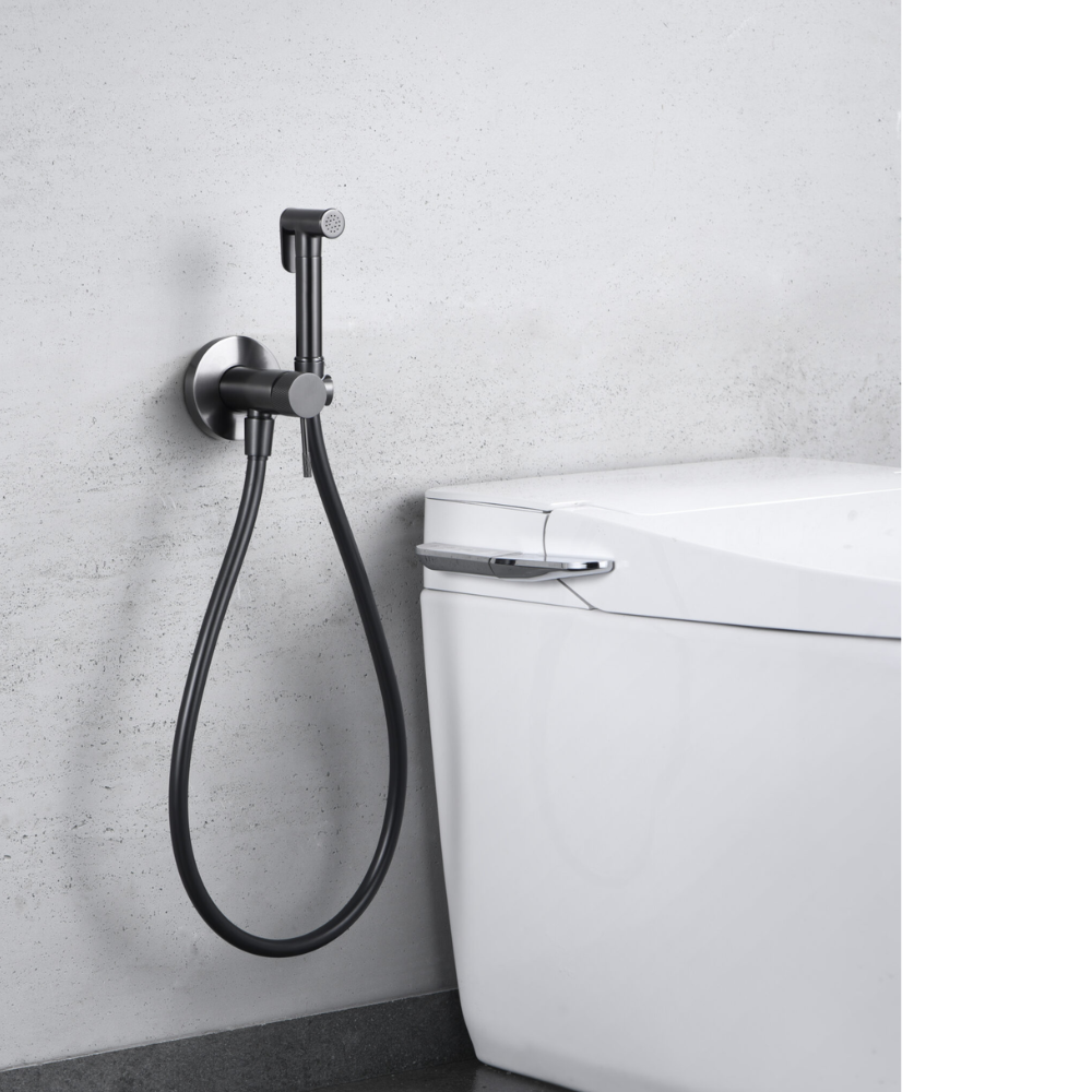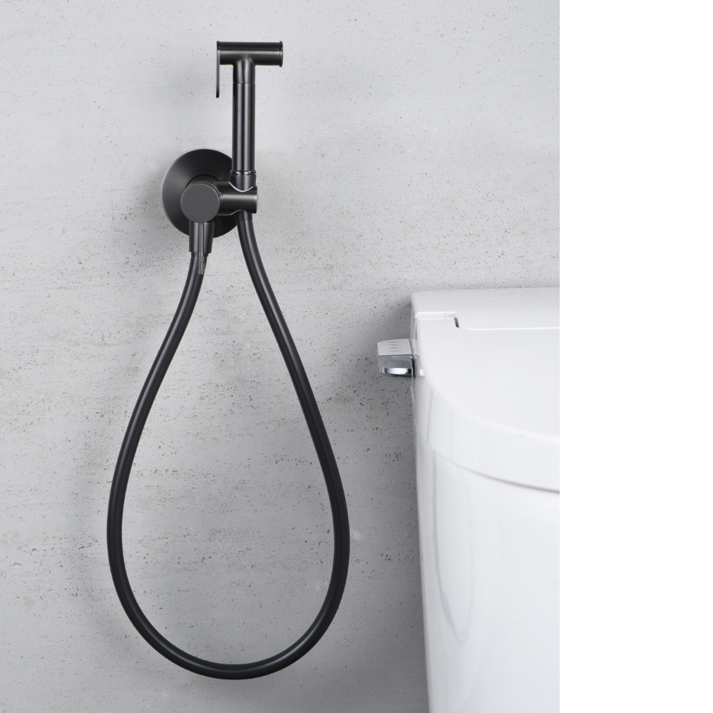 Grifería empotrada de bidé. Agua fría y caliente. Mango de 1 posición. Flexo de PVC, acabado black gun metal.