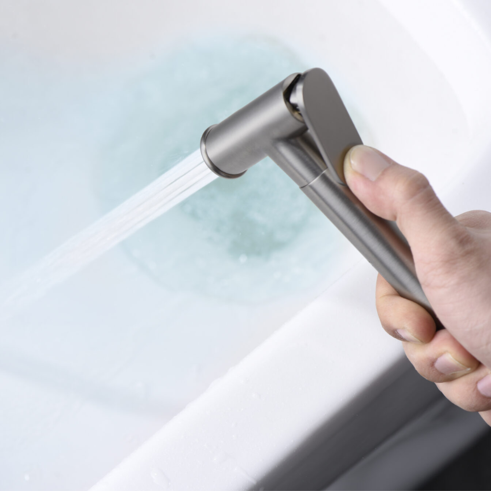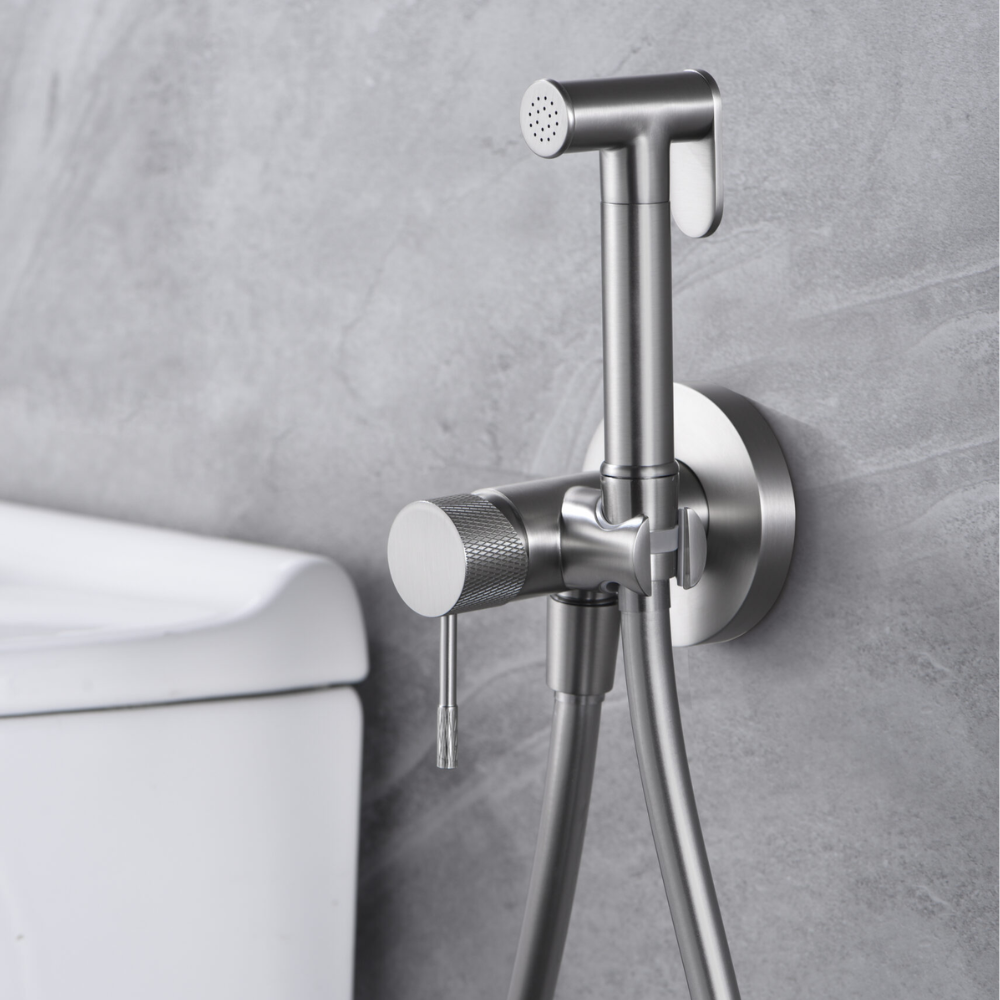 Grifería empotrada de bidé. Agua fría y caliente. Mango de 1 posición. Flexo de PVC, acabado níquel cepillado.