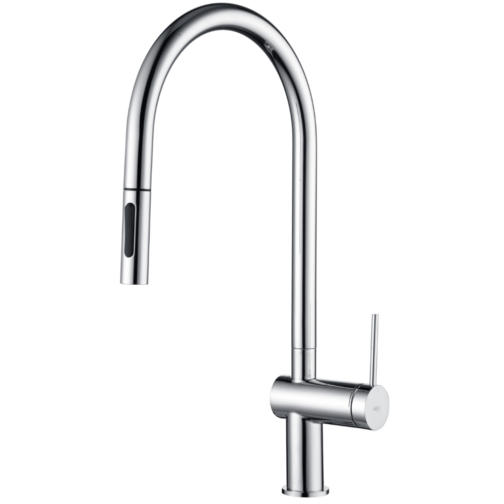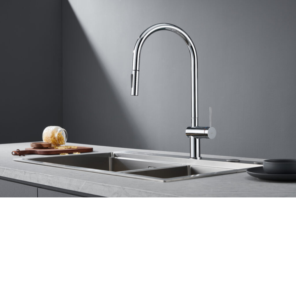 Griferia monomando extraíble. Difusor doble jet. Cuerpo de grifería latón cromado. Cartucho cerámico Ø35 mm. Sistema de ahorro de energía, apertura en frío. 46cm de altura. Flexos 50cm.