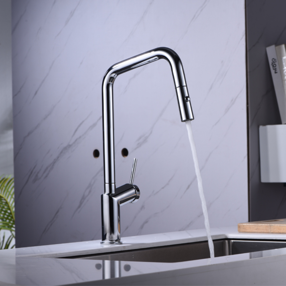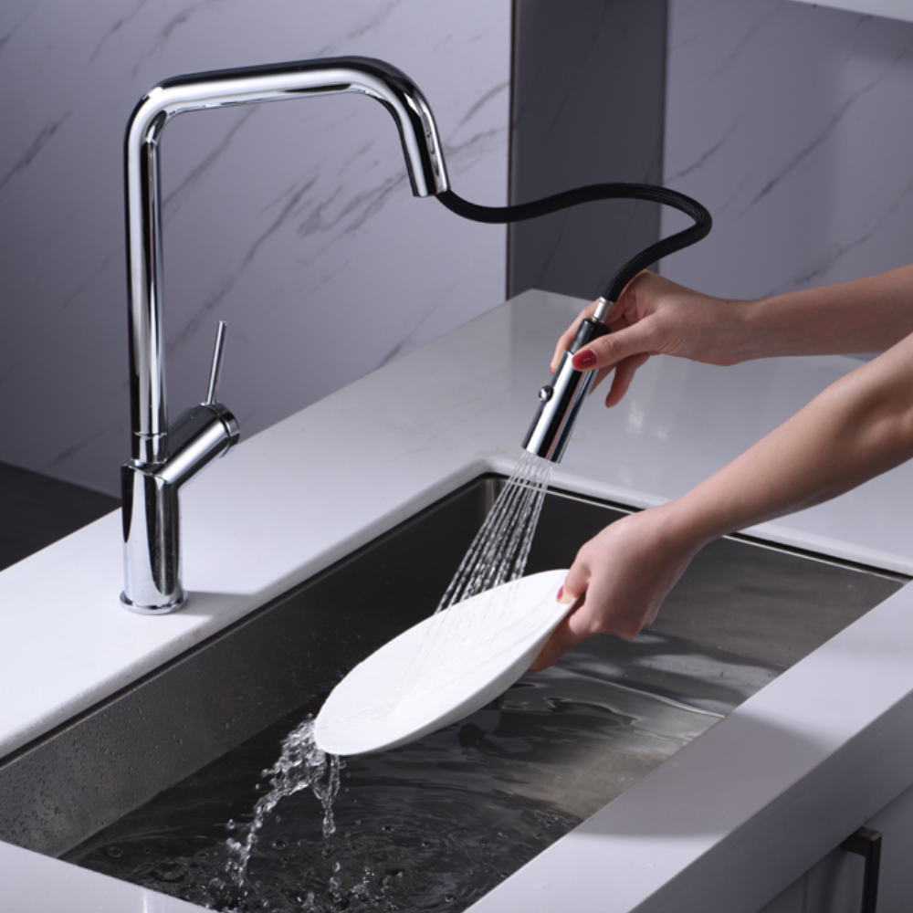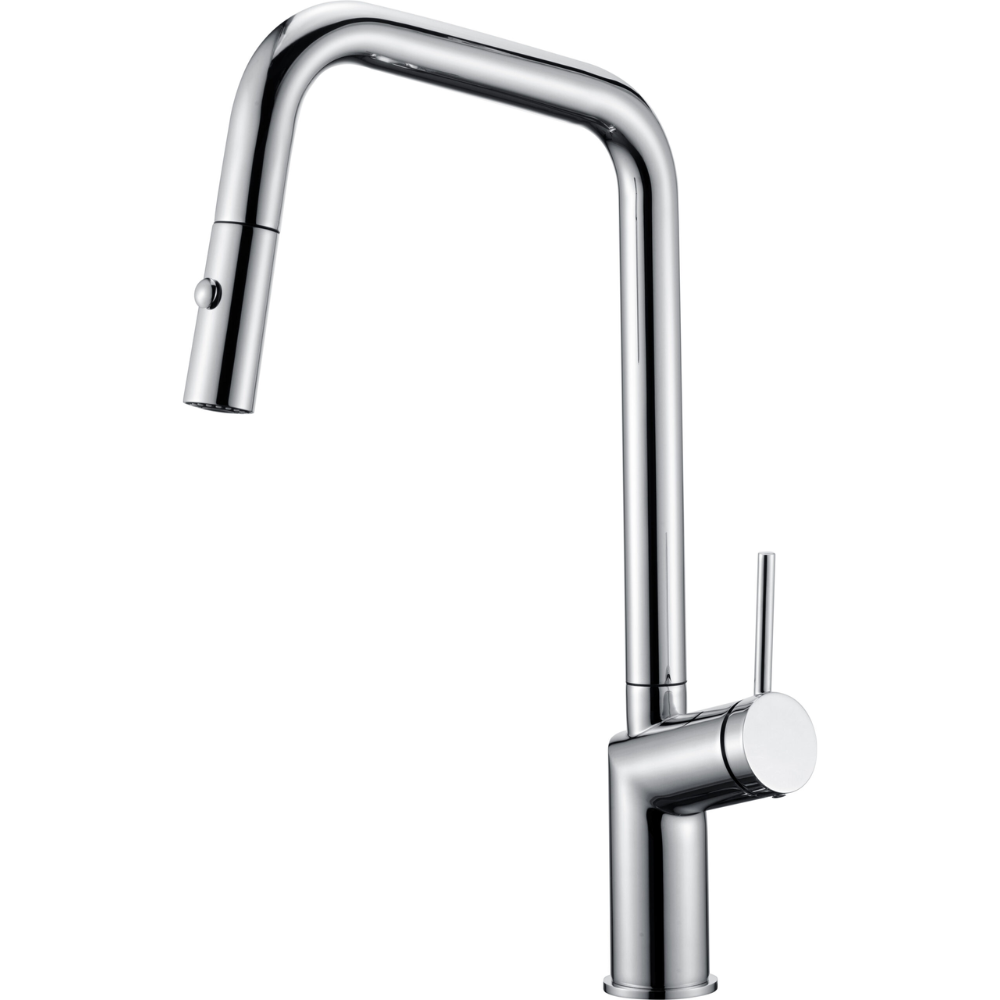 Griferia monomando extraíble. Difusor doble jet. Cuerpo de grifería latón cromado. Cartucho cerámico Ø35 mm. Flexos 50cm.