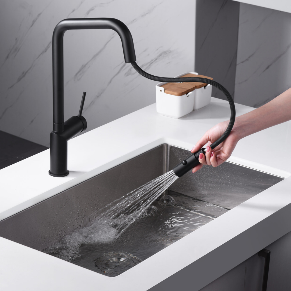 Griferia monomando extraíble. Difusor doble jet. Cuerpo de grifería latón negro mate. Cartucho cerámico Ø35 mm. Flexos 50cm.