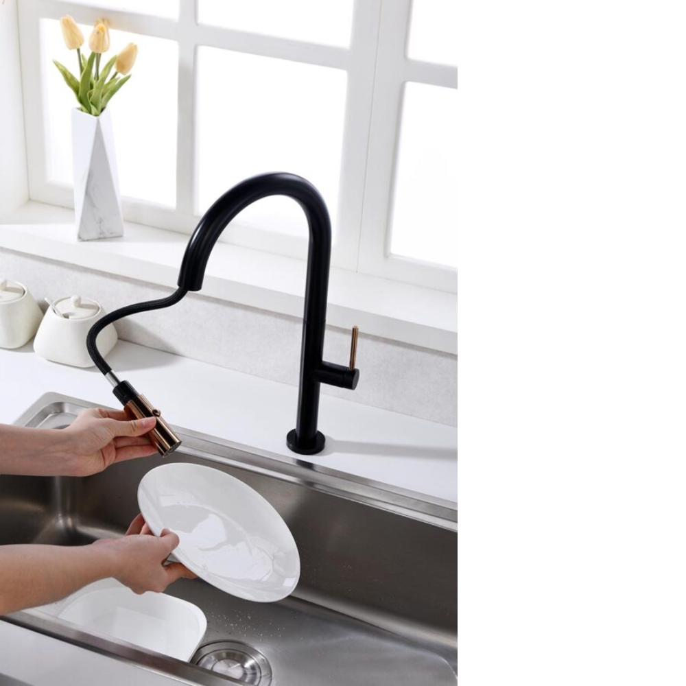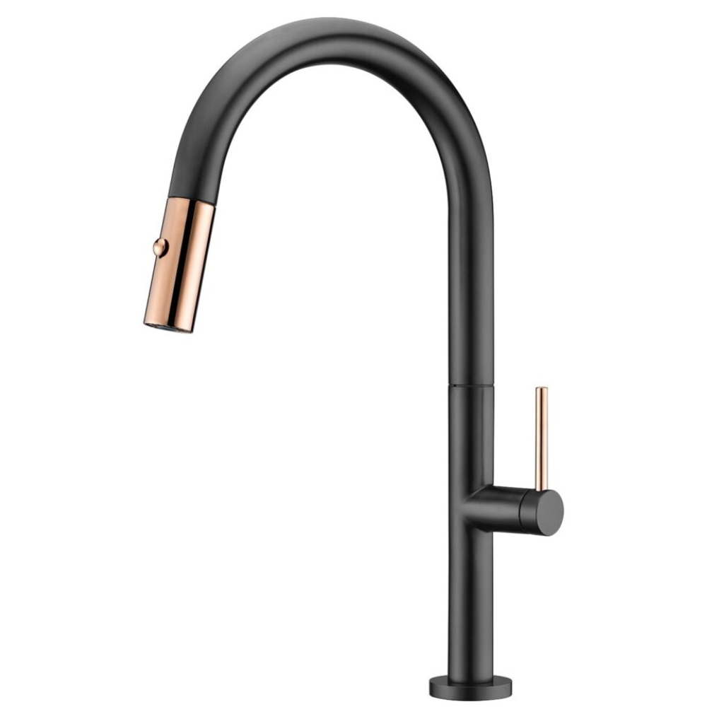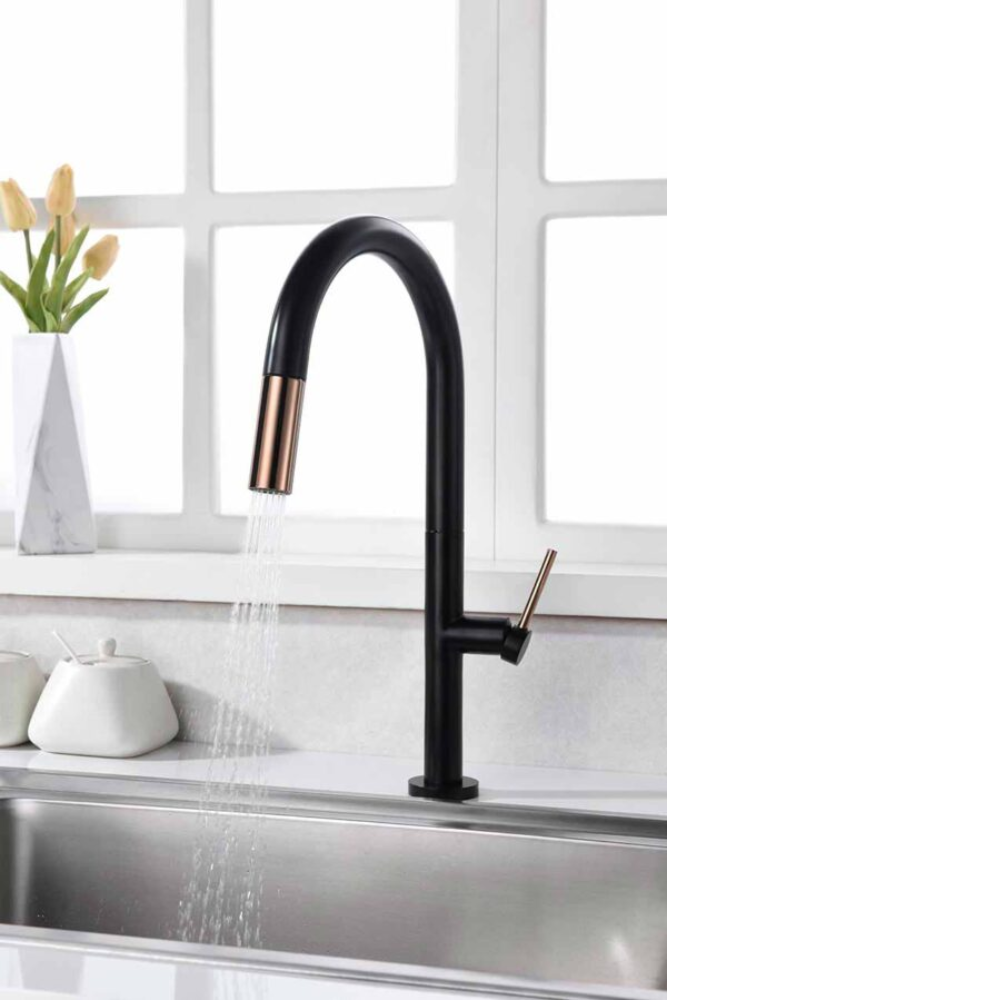 Grifería monomando extraíble. Cuerpo de grifería negro oro rosa. Cartucho cerámico de 25 mm. Latiguillos 50cm.