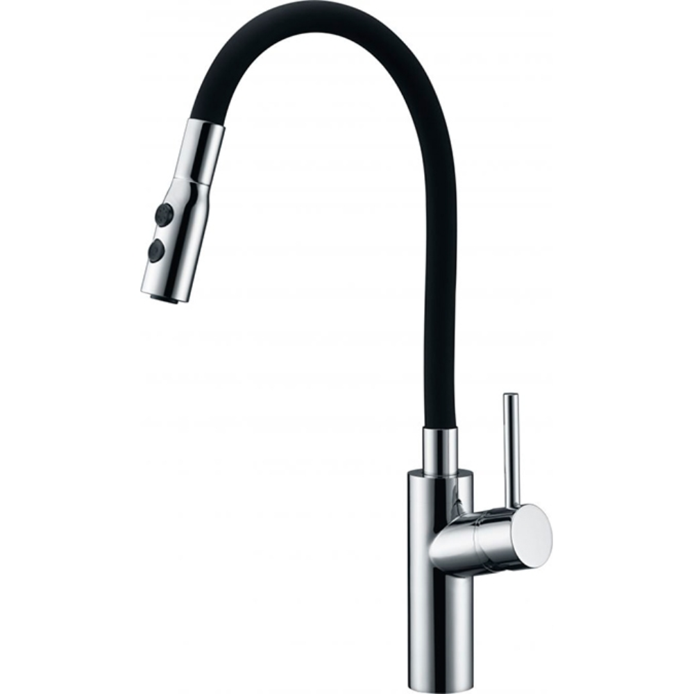 Grifería monomando de cocina. Cuerpo de grifería en Latón cromado y tubo flexible en negro mate. Sistema de ahorro energético. Cartucho cerámico de 35 mm, apertura en frío. Aireador de dos posiciones.