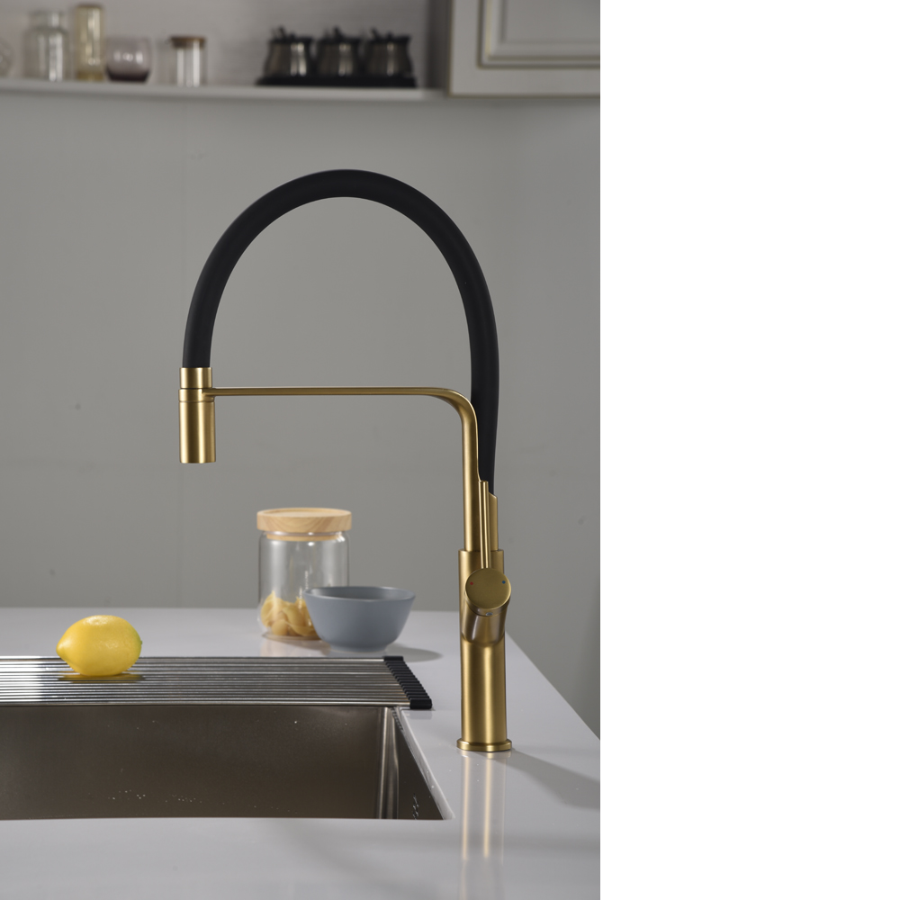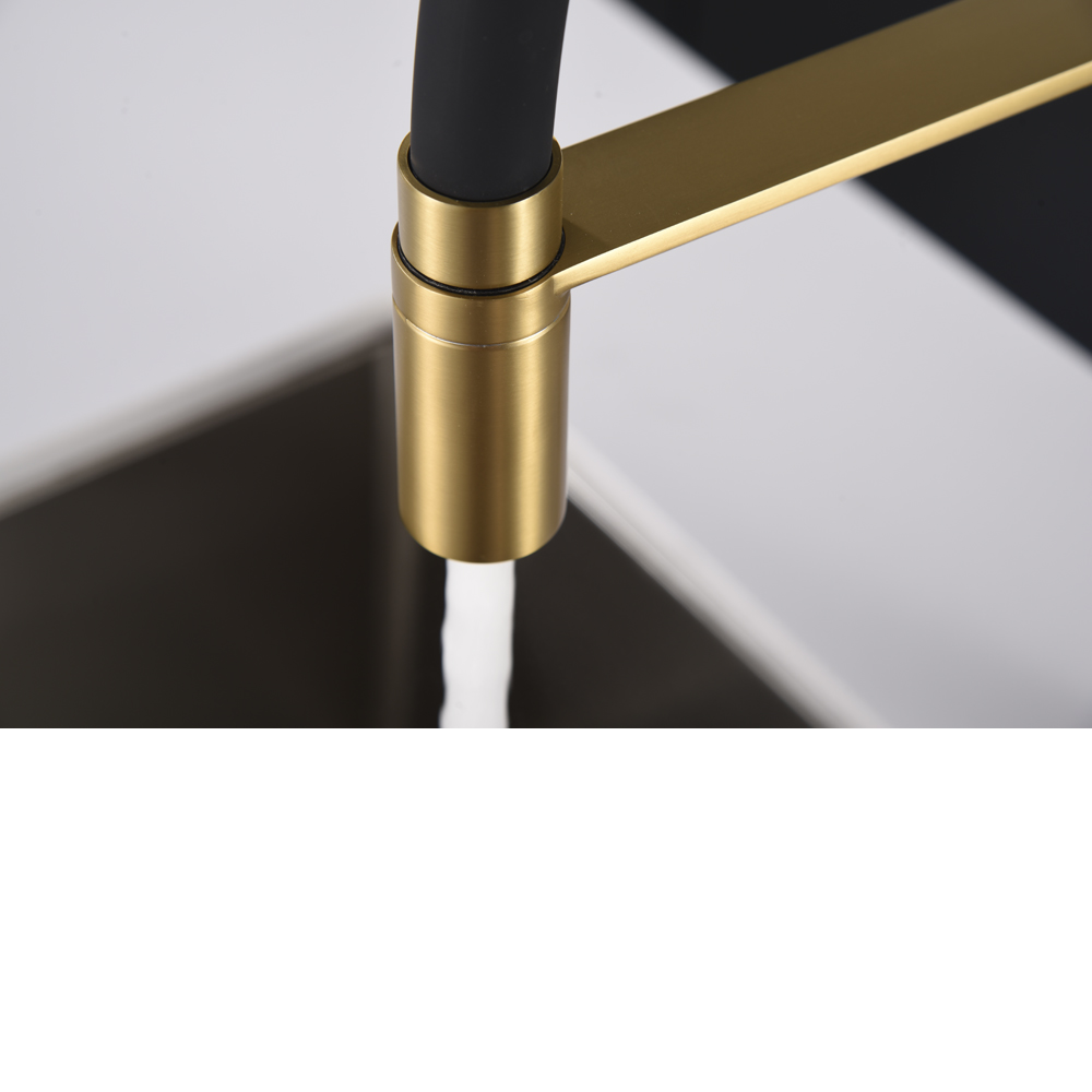 Cuerpo de grifería en latón oro cepillado y caño flexible negro mate.