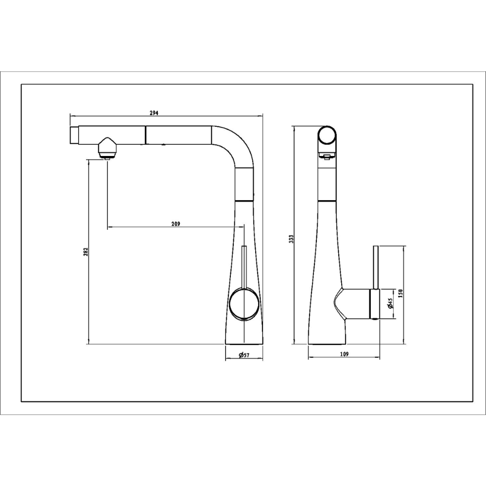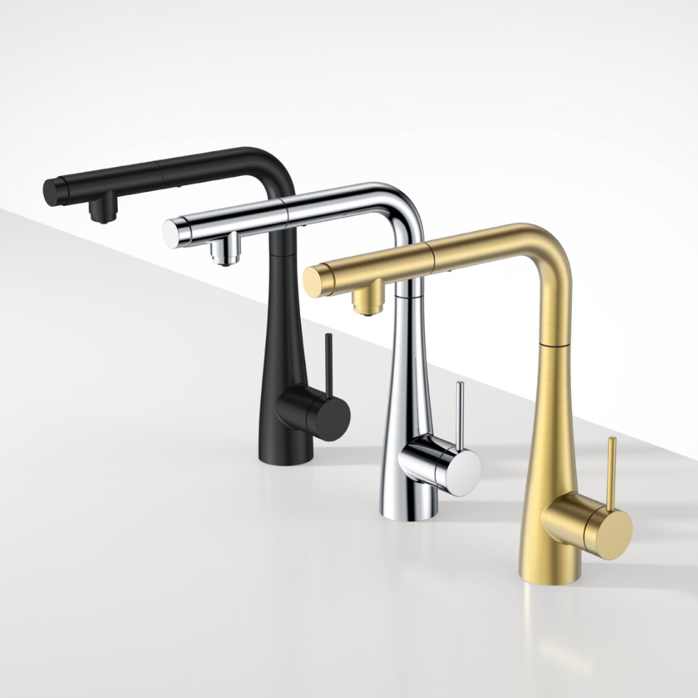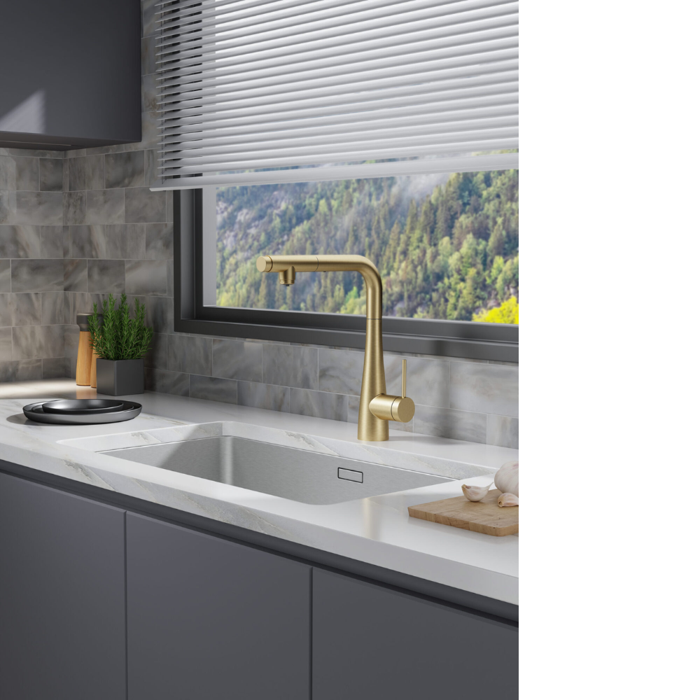 Grifería monomando extraíble de dos vías (osmosis). Botón osmosis push start/stop. Difusor 2 vías extraíble. Cuerpo de grifería de latón. Acabados oro cepillado. Cartucho cerámico Ø35mm. Cold open. Latiguillos Ø3/8”.