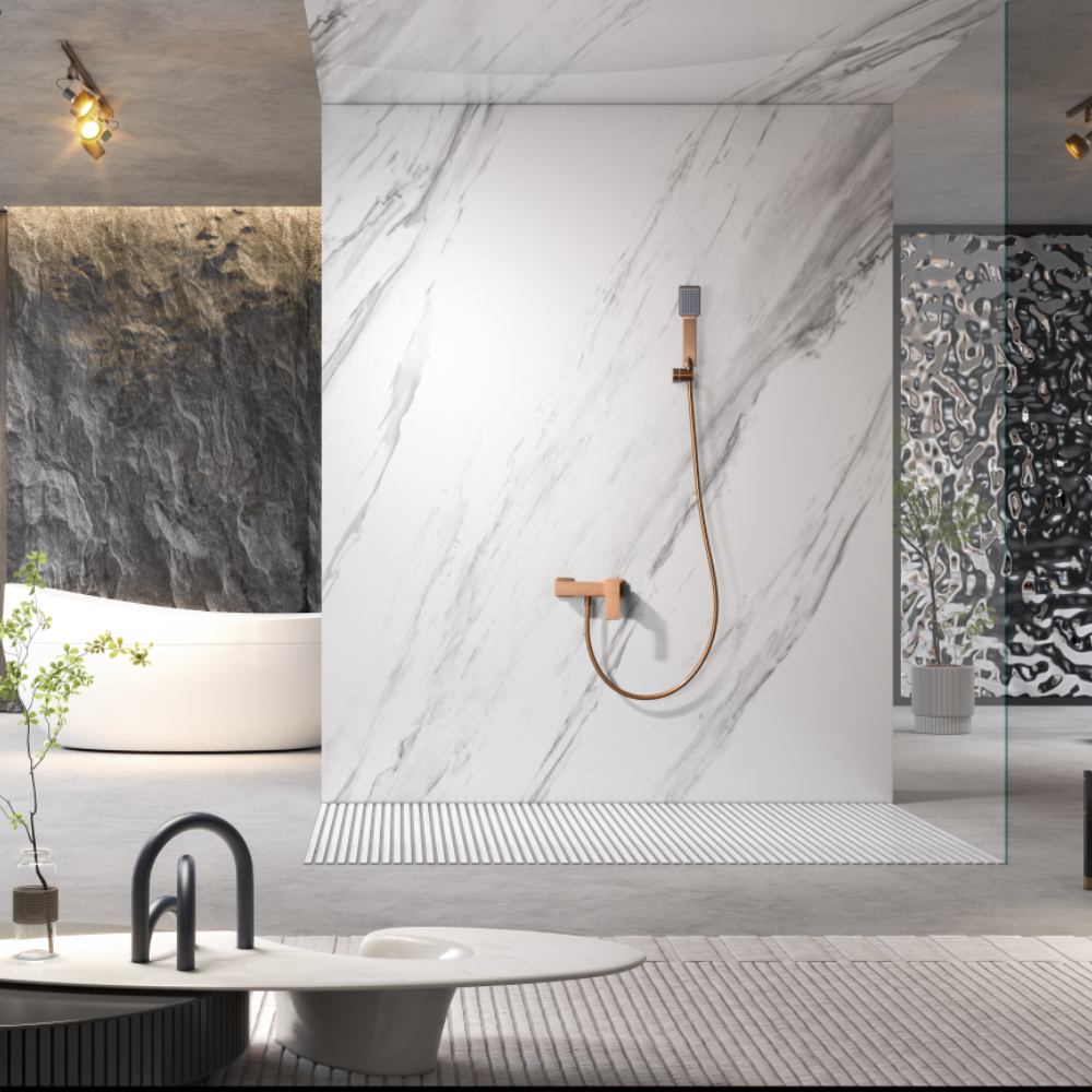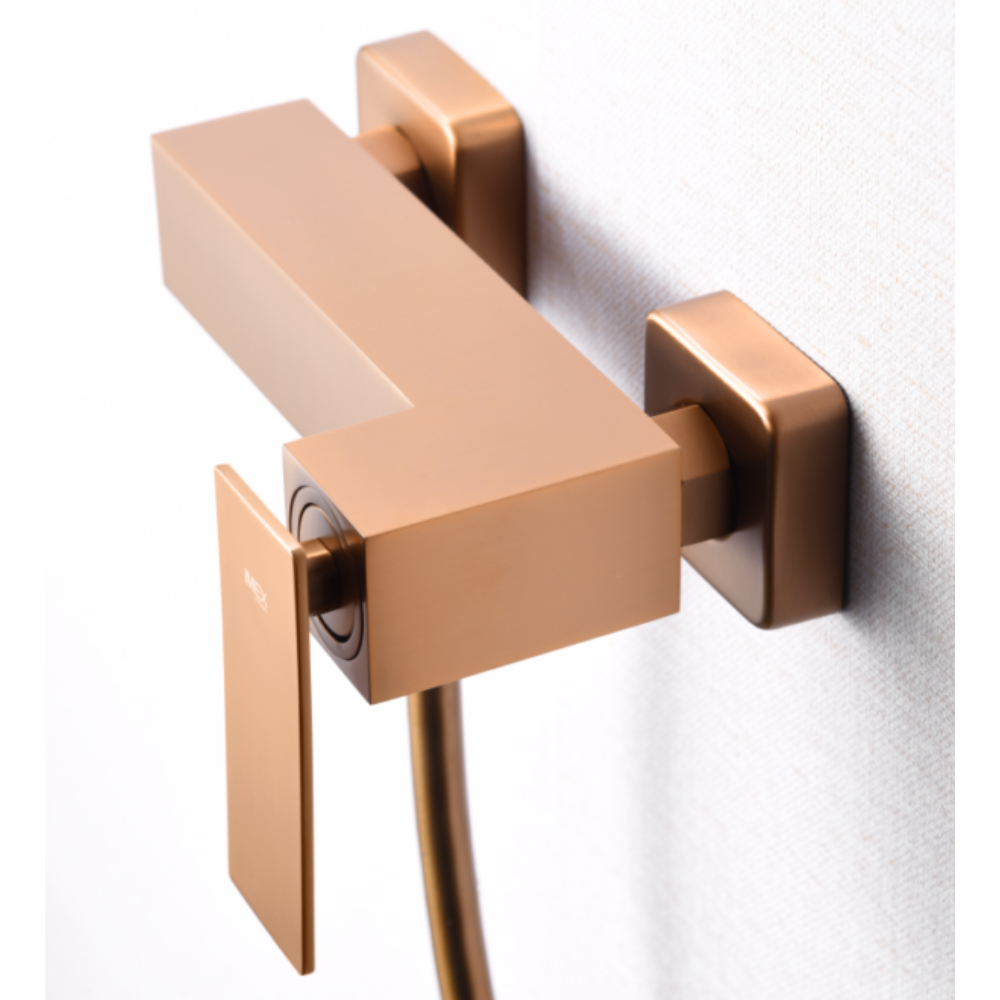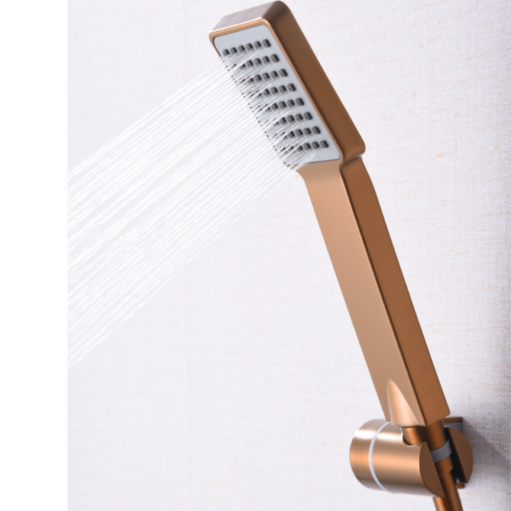 Grifería para ducha en latón. Soporte para mango de ducha de ABS. Mango ducha cuadrado. Caudal medio 12 I/min. Flexo PVC 1,8m. Cartucho monomando cerámico Ø35mm.