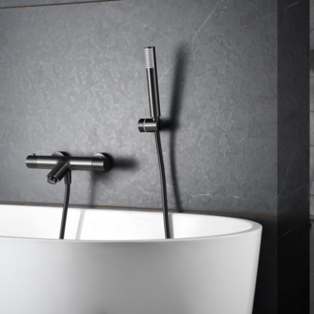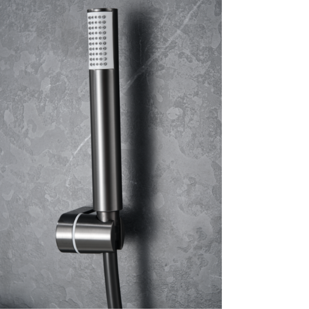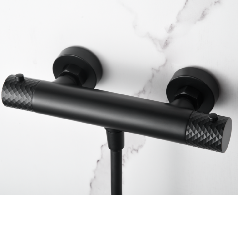 Grifería para ducha en latón. Acabado negro mate. Soporte para mango de ducha ABS. Mango de ducha redondo de 1 posición. Flexo PVC 1.8 m. Caudal medio 12 l/min. Cartucho termostático autolimpiable TURN CLEAN SYSTEM (exclusivo)