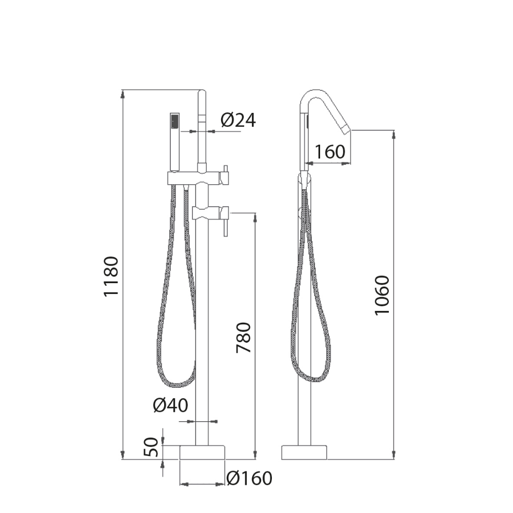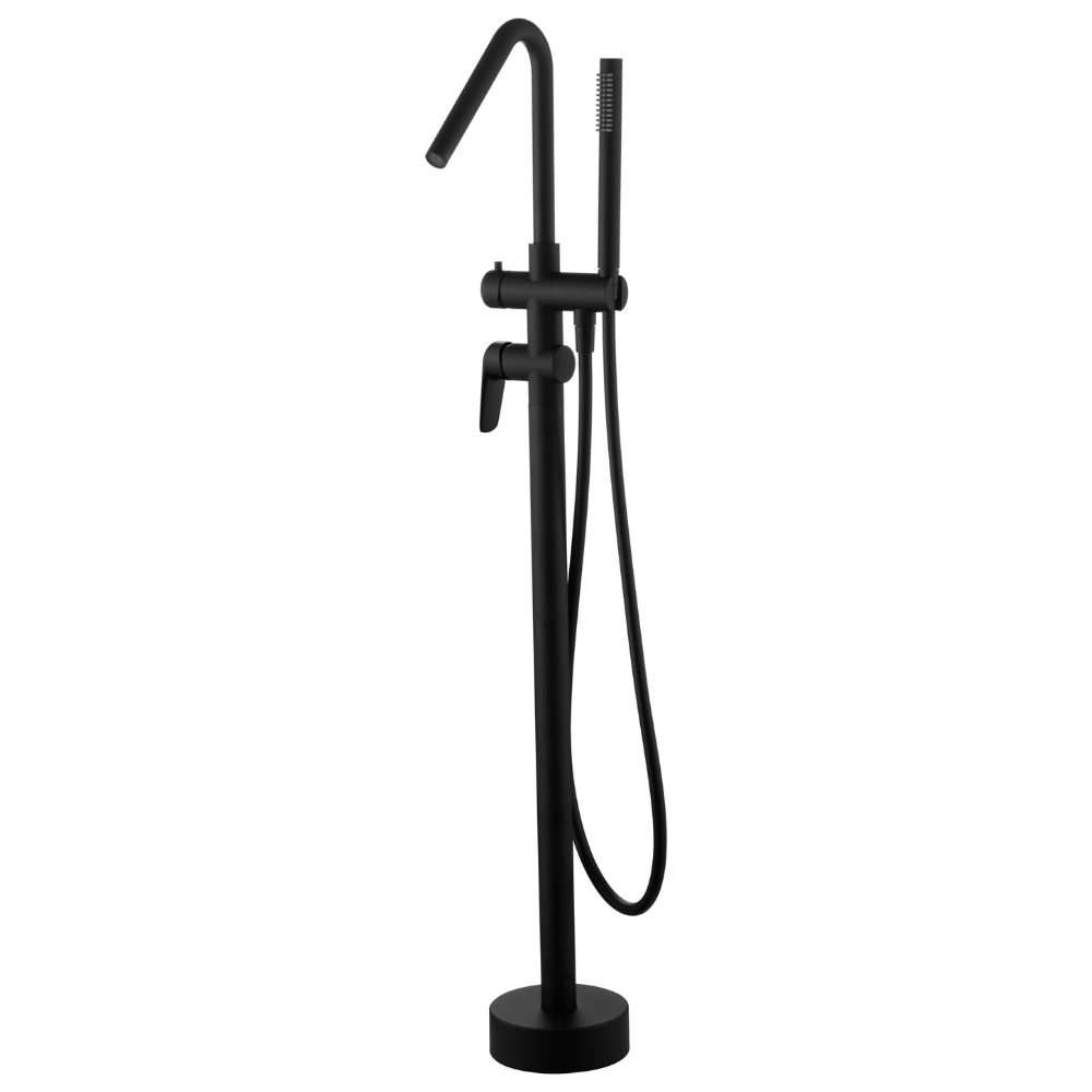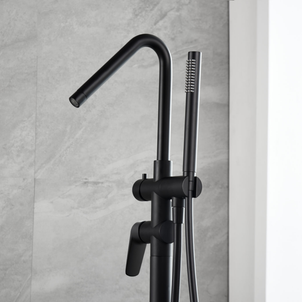 Grifería exenta de bañera en latón negro mate. Cartucho cerámico de 35 mm. Mango de ducha negro mate redondo, 1 posición Flexo de PVC negro mate Caja de registro a suelo.