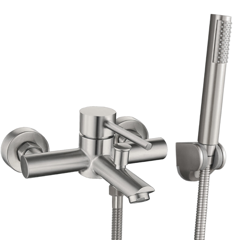Incluye: cuerpo de la grifería de latón, caño bañera, cartucho cerámico, flexo de acero inoxidable y alcachofa de mano de ABS Acabado: acero cepillado