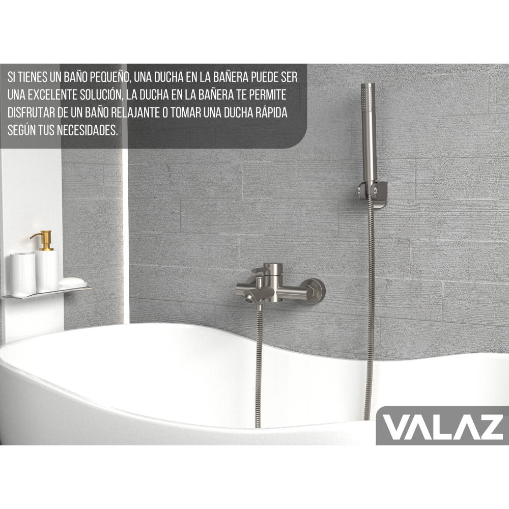 Incluye: cuerpo de la grifería de latón, caño bañera, cartucho cerámico, flexo de acero inoxidable y alcachofa de mano de ABS