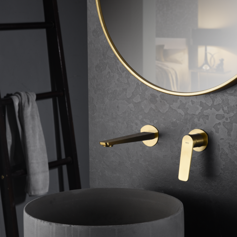 Grifería empotrada monomando Latón acabado oro cepillado. En dos partes independientes. Cuerpo empotrado directo a pared. Sin caja de registro