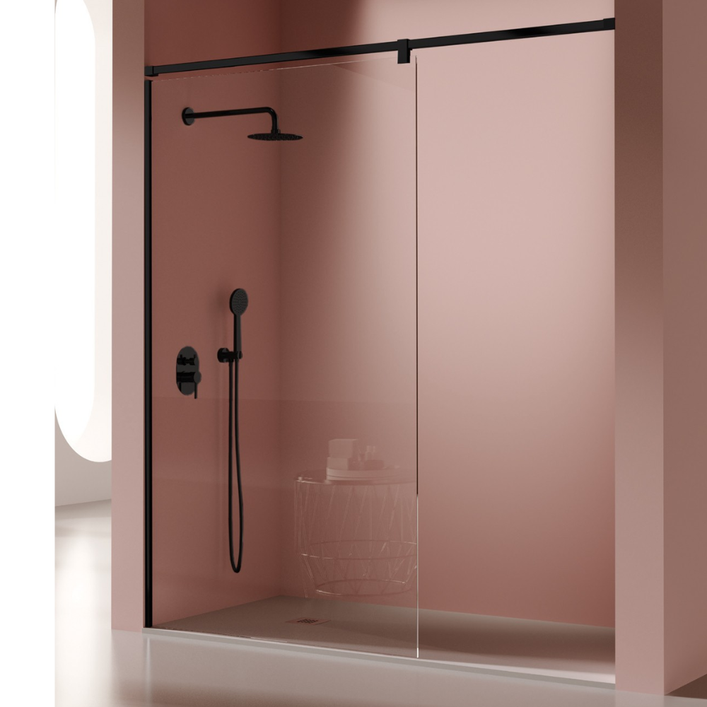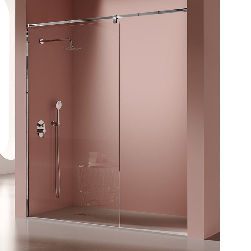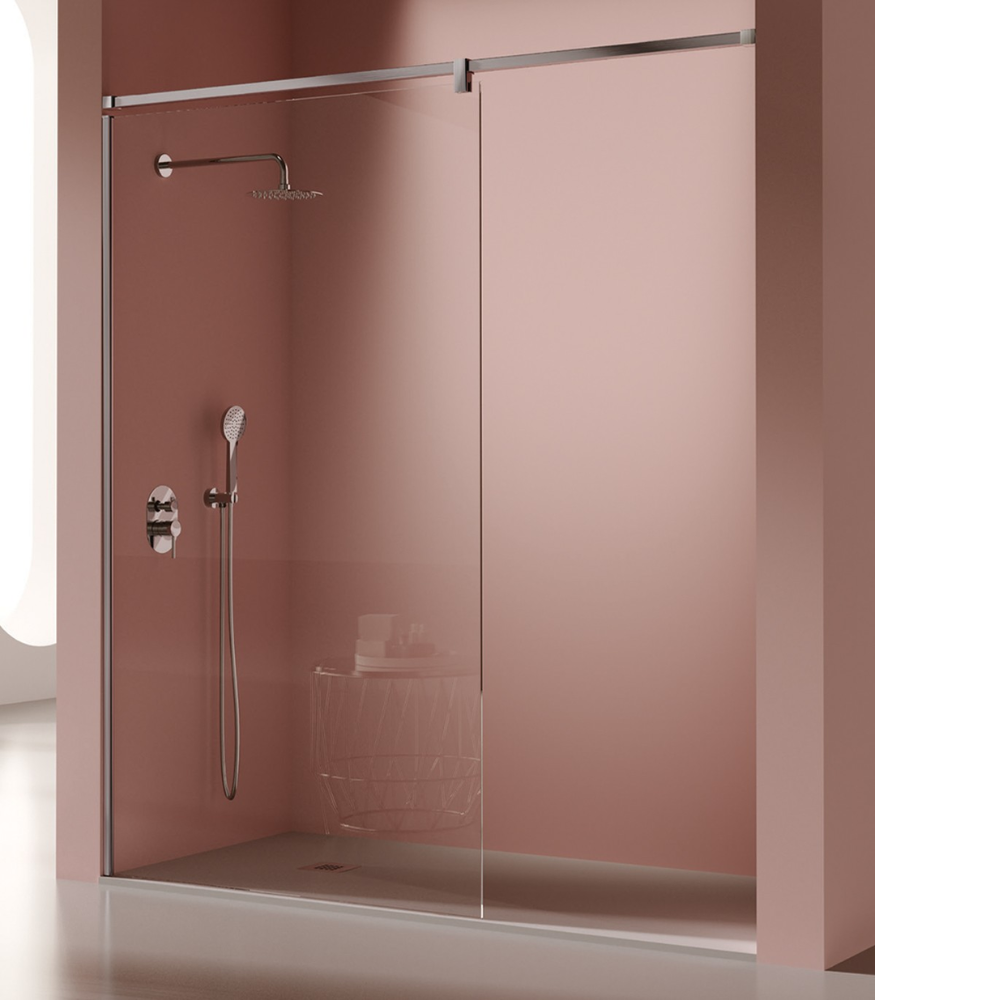 Composición: Panel fijo de ducha (reversible) con brazo de pared a pared con pinza de sujeción al cristal