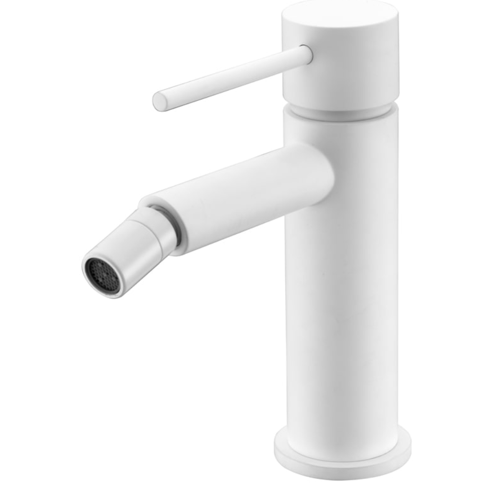 Monomando bidé. Cuerpo grifería en latón. Acabado blanco mate. Cartucho cerámico Ø26mm. Latiguillos 3/8″.
