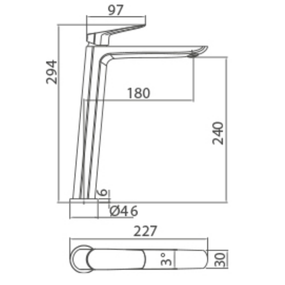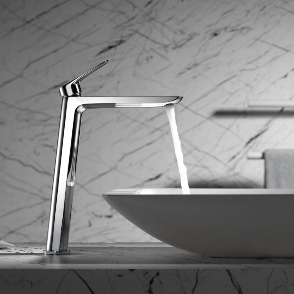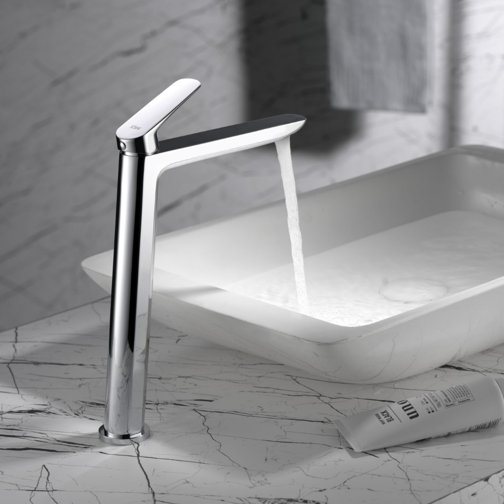 Monomando lavabo alto cromo. Cuerpo grifería en latón cromado. Cartucho cerámico de 25mm. Latiguillos 3/8. Aireador extraplano.