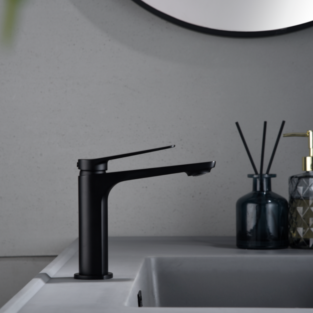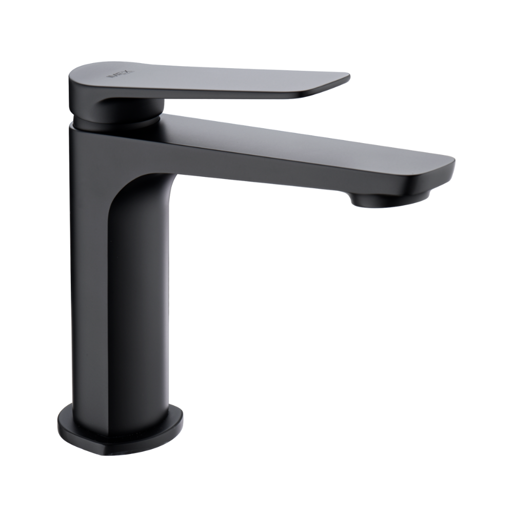Monomando de lavabo. Cuerpo de grifería en latón. Acabado negro mate. Cartucho cerámico Ø26mm. TOP Flexos Ø3/8″.