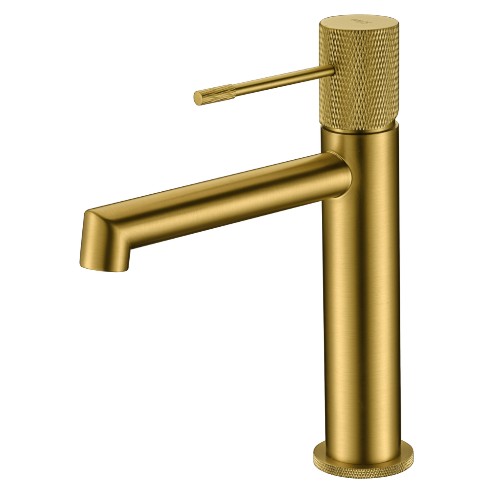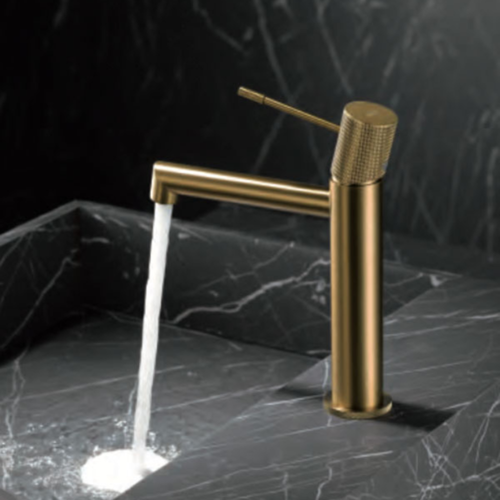 Cuerpo grifería en latón oro cepillado. Cartucho cerámico de 35mm. Latiguillos 3/8.