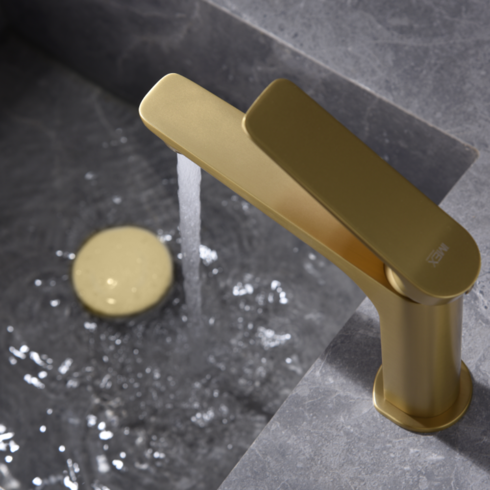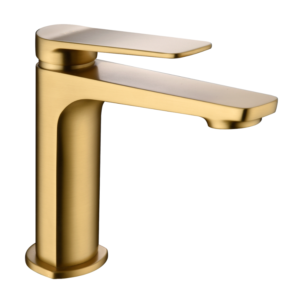 Monomando de lavabo. Cuerpo de grifería en latón. Acabado oro cepillado. Cartucho cerámico Ø26mm. TOP Flexos Ø3/8″.